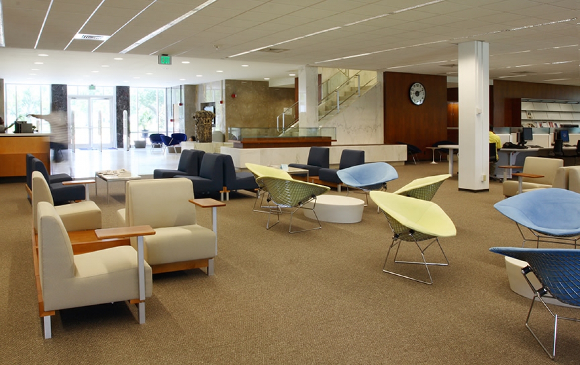 The scope of work encompassed a complete re-evaluation of the circulation, technical services, collection display and storage, and student use areas of the library in order to maximize efficiency. This was achieved through new interior finishes, reconfiguration of the shelving layout throughout the building, the addition of multiple types of group and individual areas designed to encourage either quiet study or socialization, and a prominent and efficient circulation area to accommodate projected growth in staff and student enrollment.